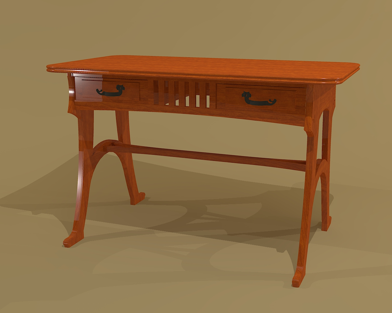 Stonefield Floating-Top Desk This model is based on an American mid-century (1960s) desk. The desk sits on 4 turned legs (back legs extend to the top desk surface) with 4 side drawers and a center drawer. The top gives the allusion of floating. The construction uses dados, dowels and dovetail joinery. |