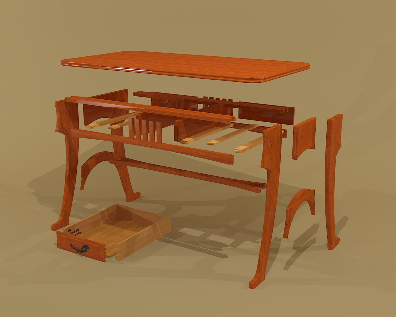Stonefield Floating-Top Desk This model is based on an American mid-century (1960s) desk. The desk sits on 4 turned legs (back legs extend to the top desk surface) with 4 side drawers and a center drawer. The top gives the allusion of floating. The construction uses dados, dowels and dovetail joinery. |
