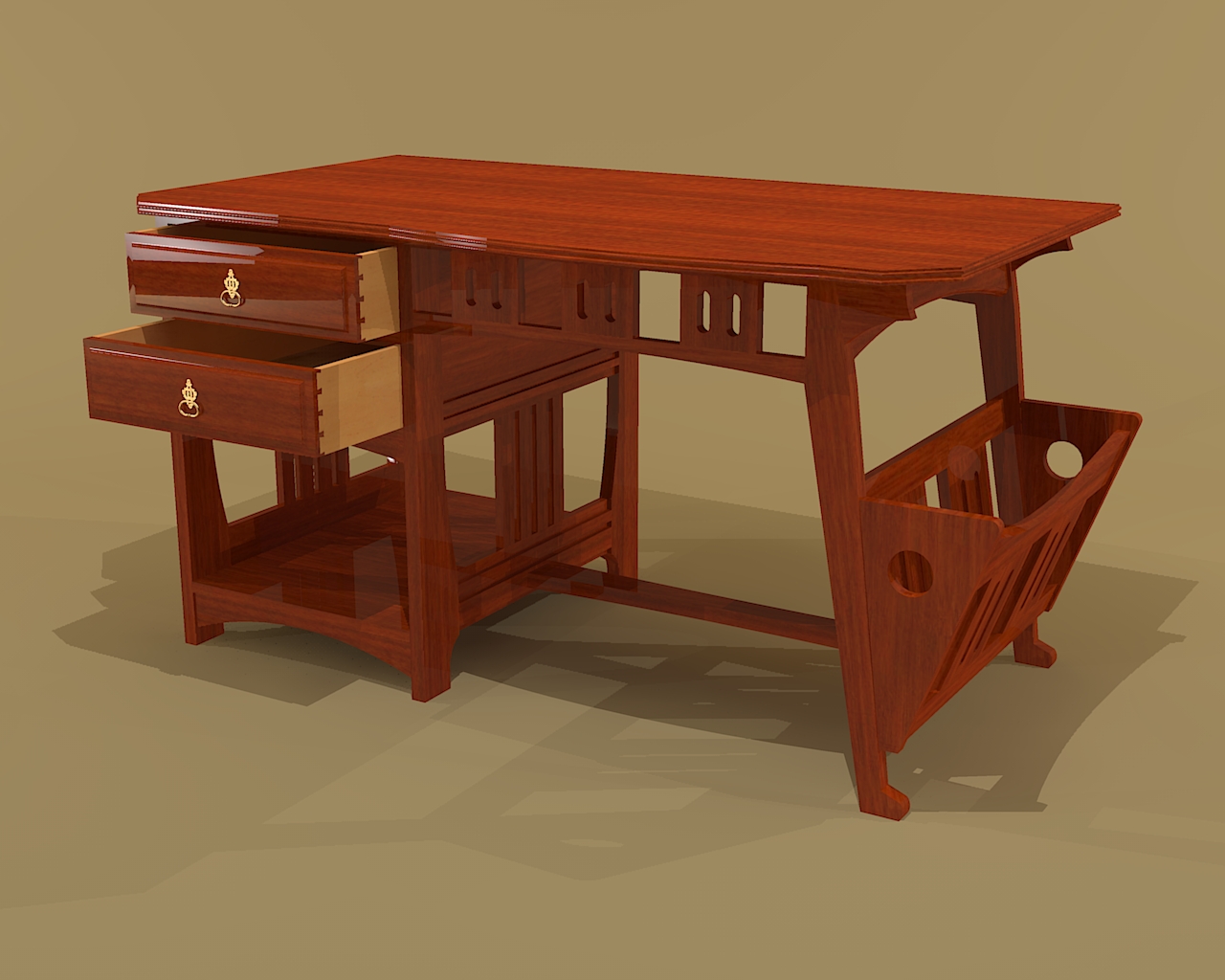 Italian Teak Desk This drawing is based on a Italian desk from the 1960s. The writing surface pulls out for use and the top lid slides up and out of the way for access to the desk compartments. There are 4 internal walnut drawers. The desk sits on a wooden structure and each leg has an exposed final. |